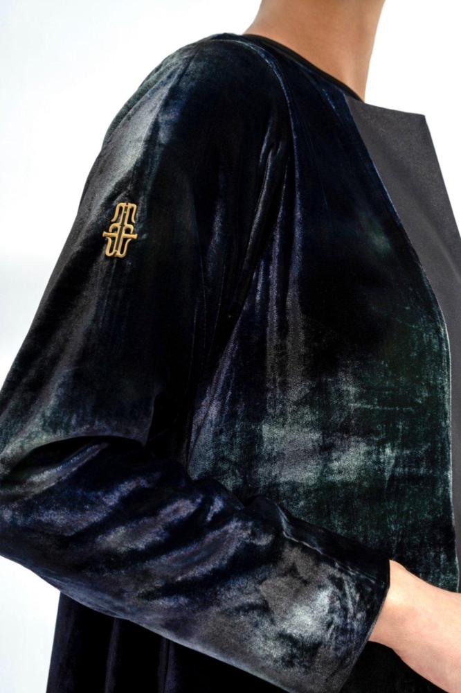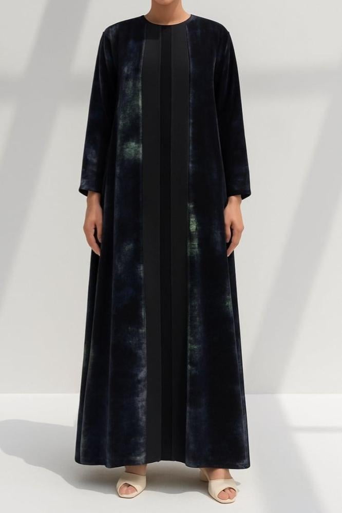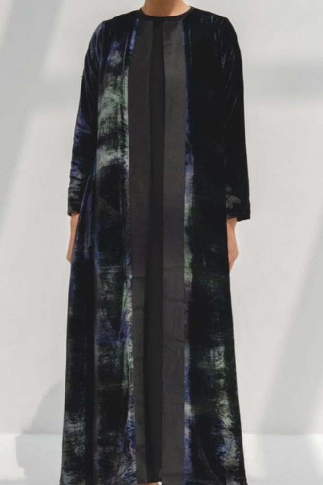 وصف العباية: عباية مخمل أسود كوري مموج بلون فيروزي و لون بنفسجي مبطنه بالكامل