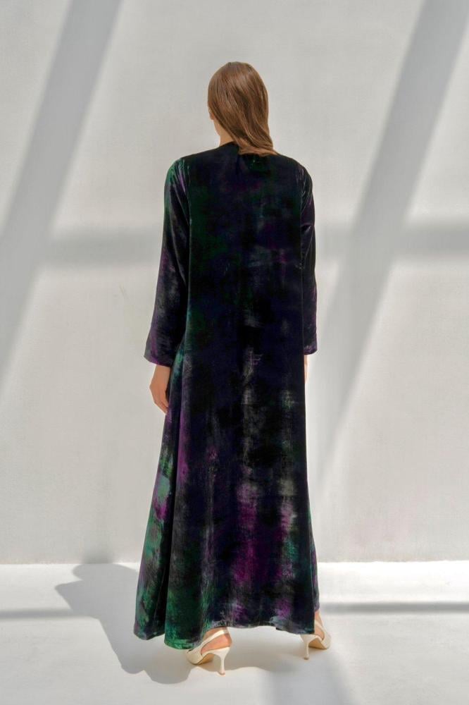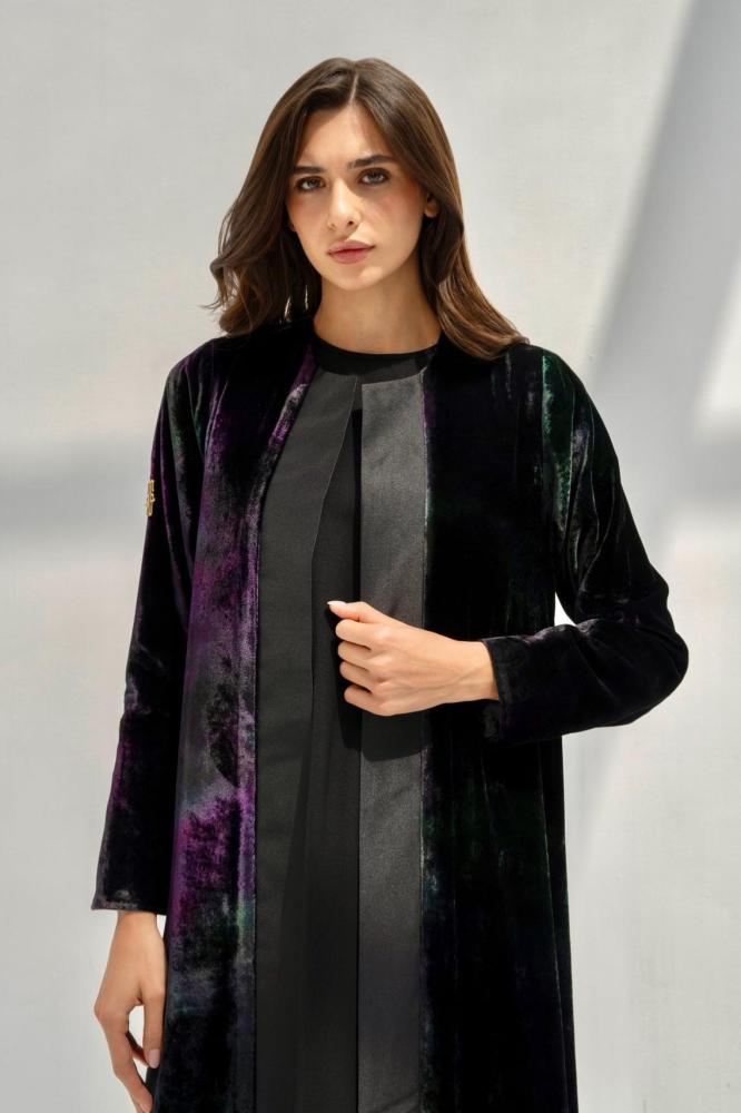 وصف العباية: عباية مخمل أسود كوري مموج بلون أخضر و لون أرجواني مبطنه بالكامل