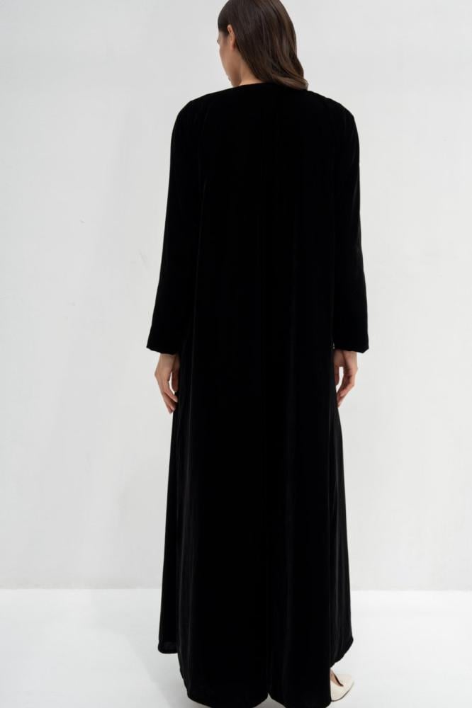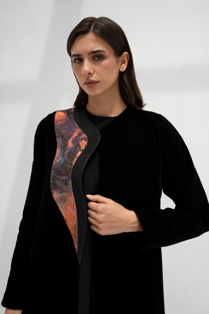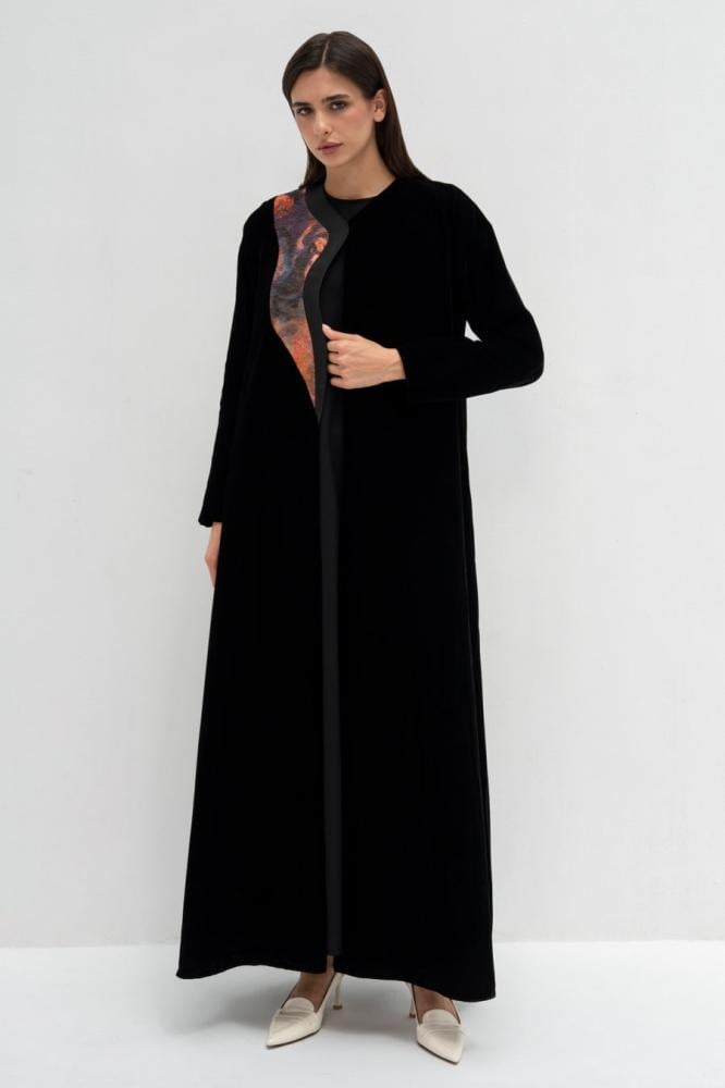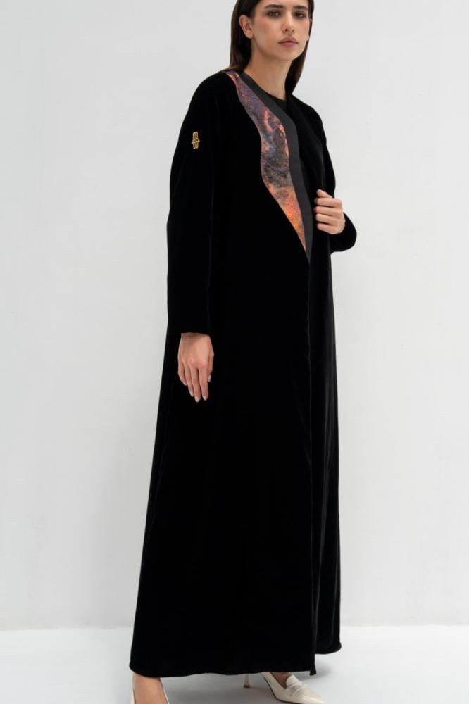 وصف العباية: عباية مخمل أسود كوري مبطنه بالكامل محدده بتفته فرنسي أسود واورنج