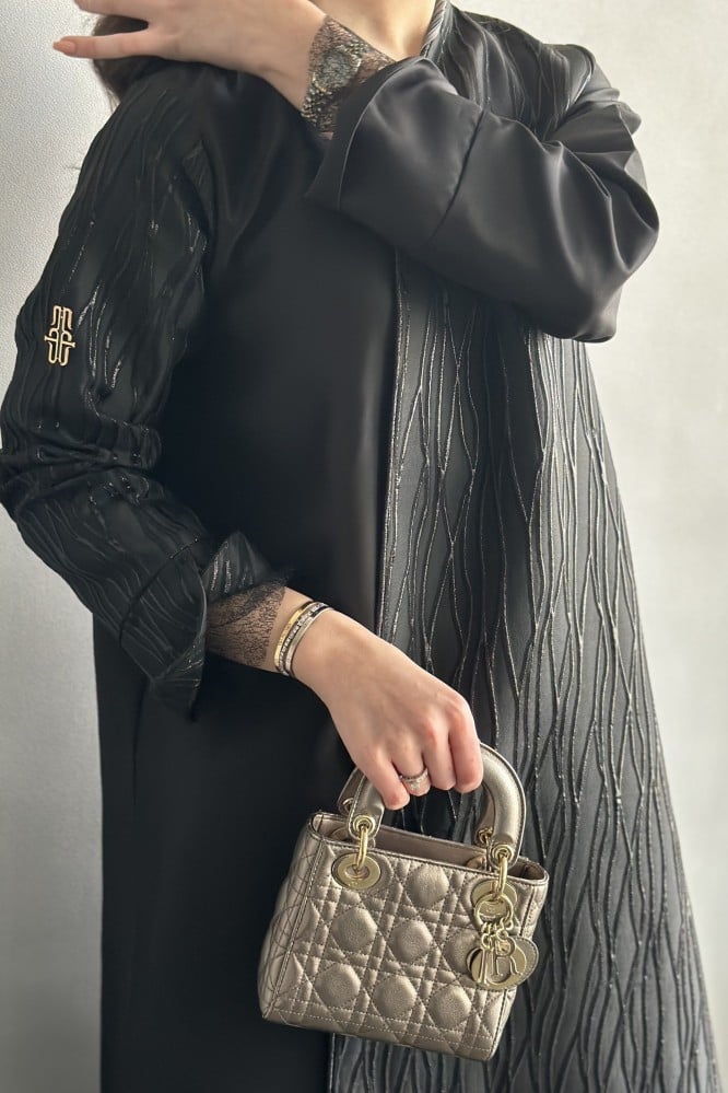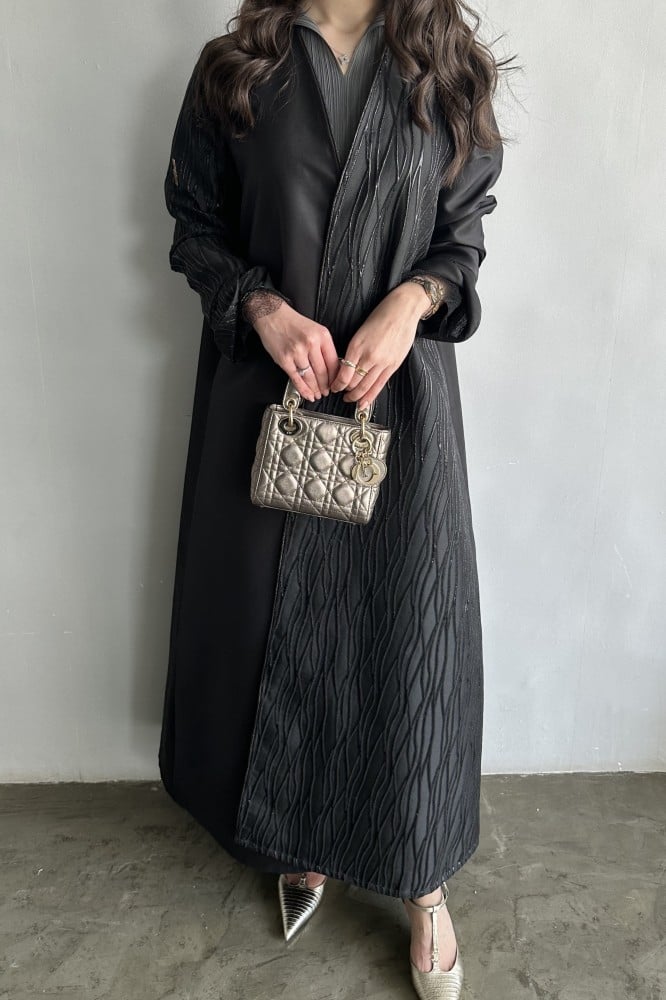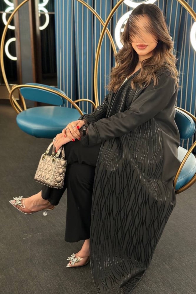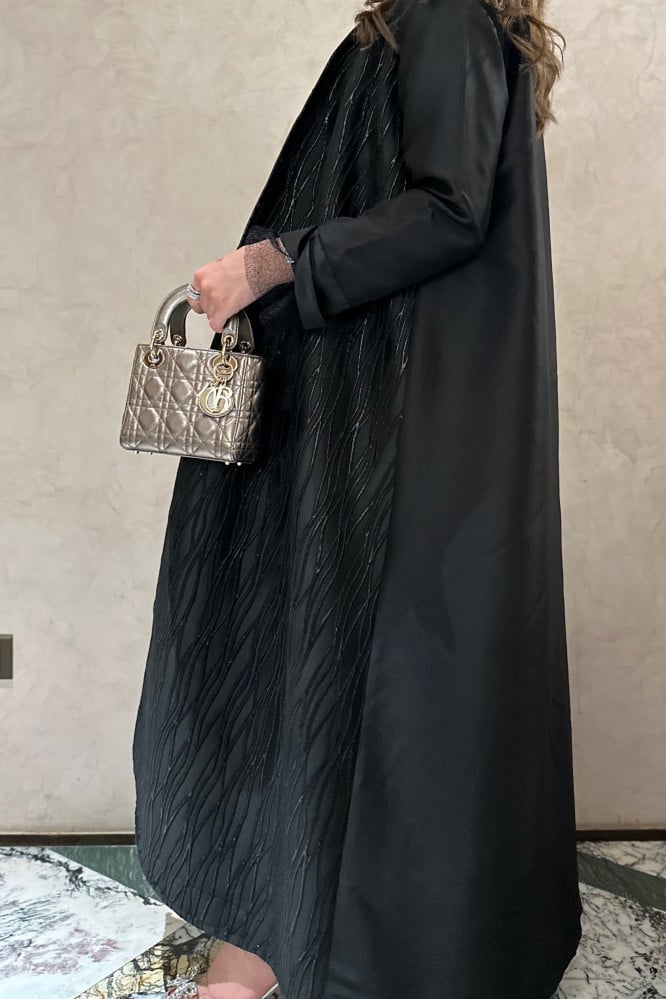 وصف العباية: عباية مصممة التفته الأسود المخطط بفضي جهه واحده لف