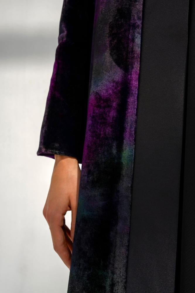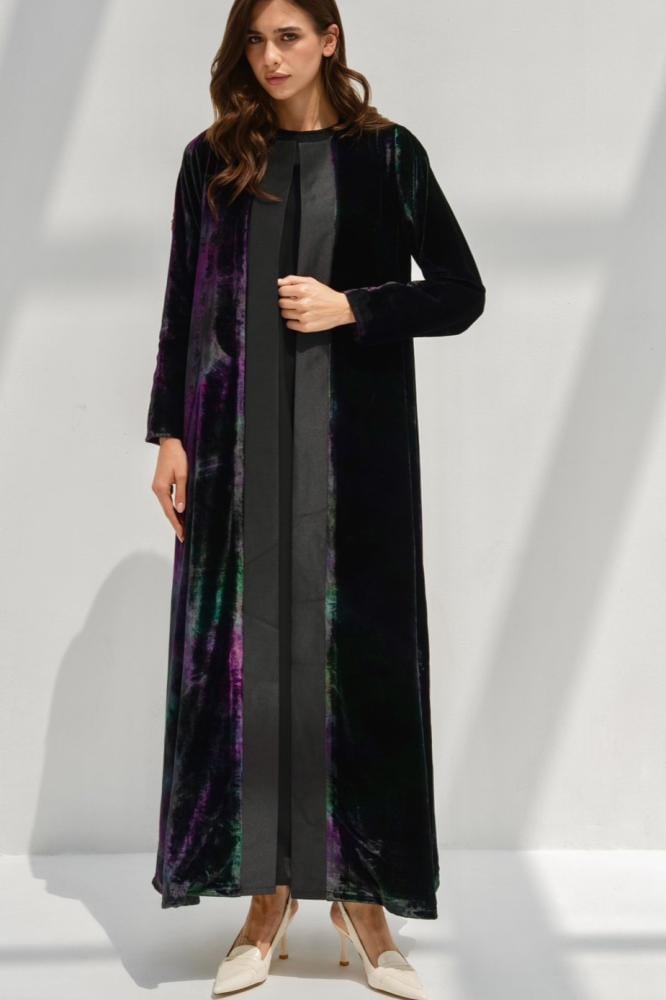 وصف العباية: عباية مخمل أسود كوري مموج بلون أخضر و لون أرجواني مبطنه بالكامل
