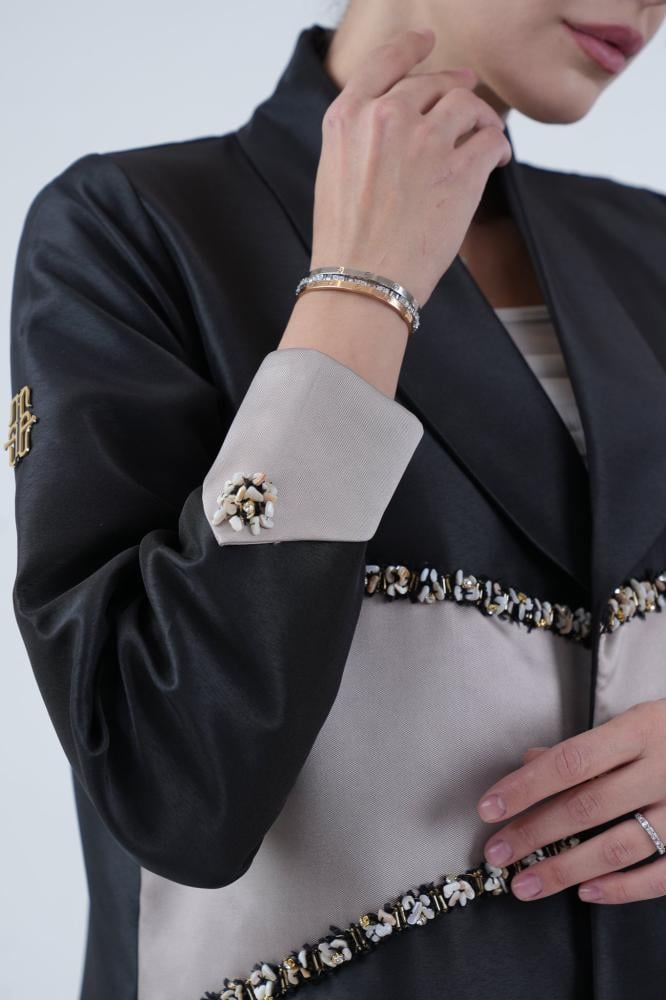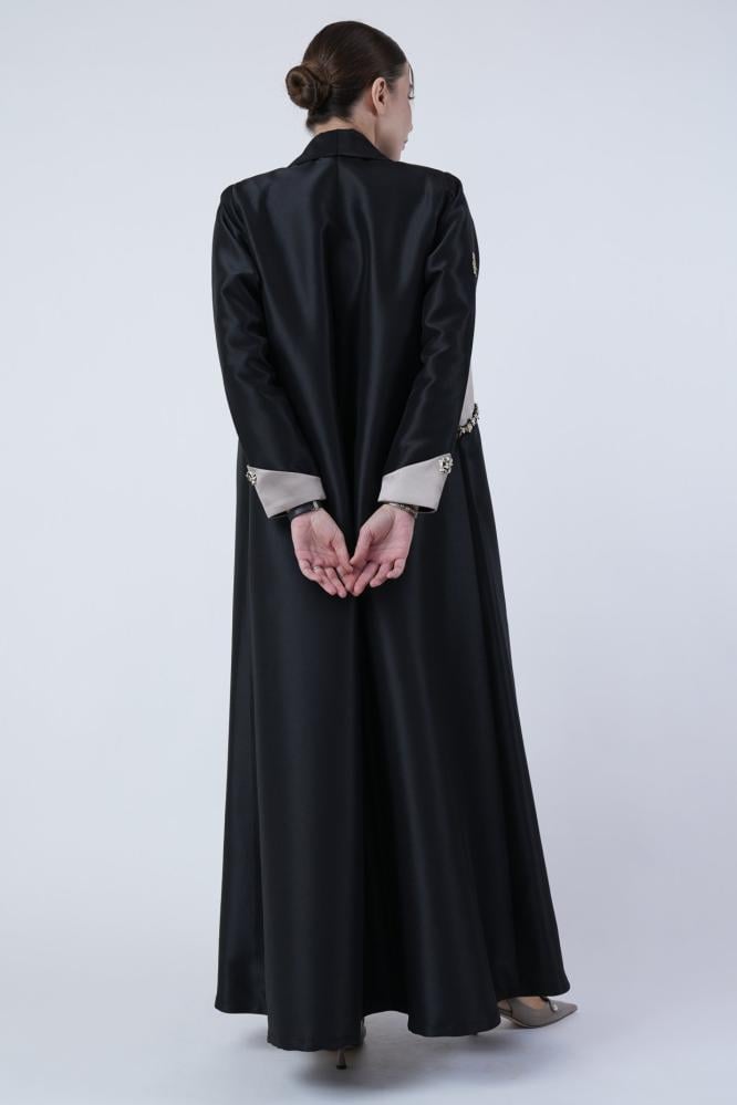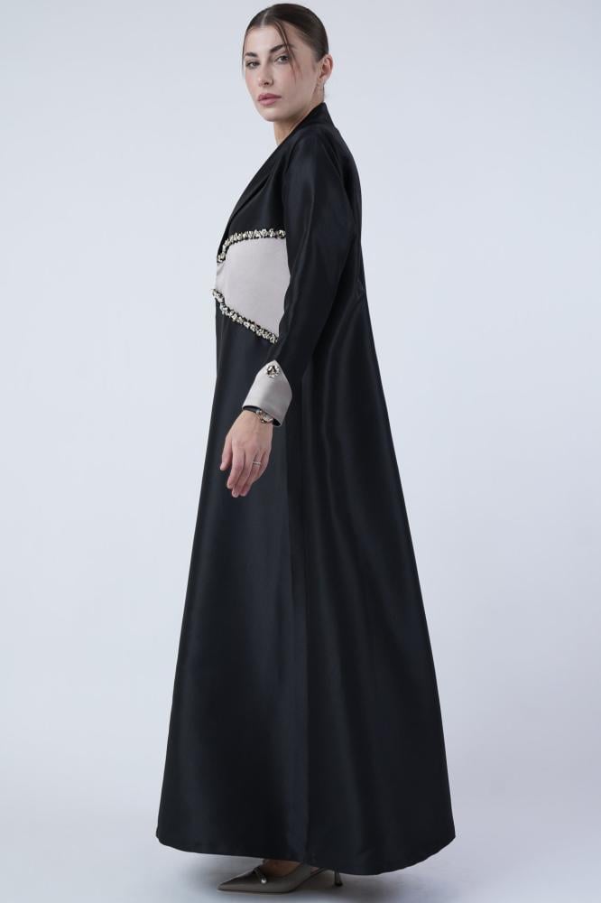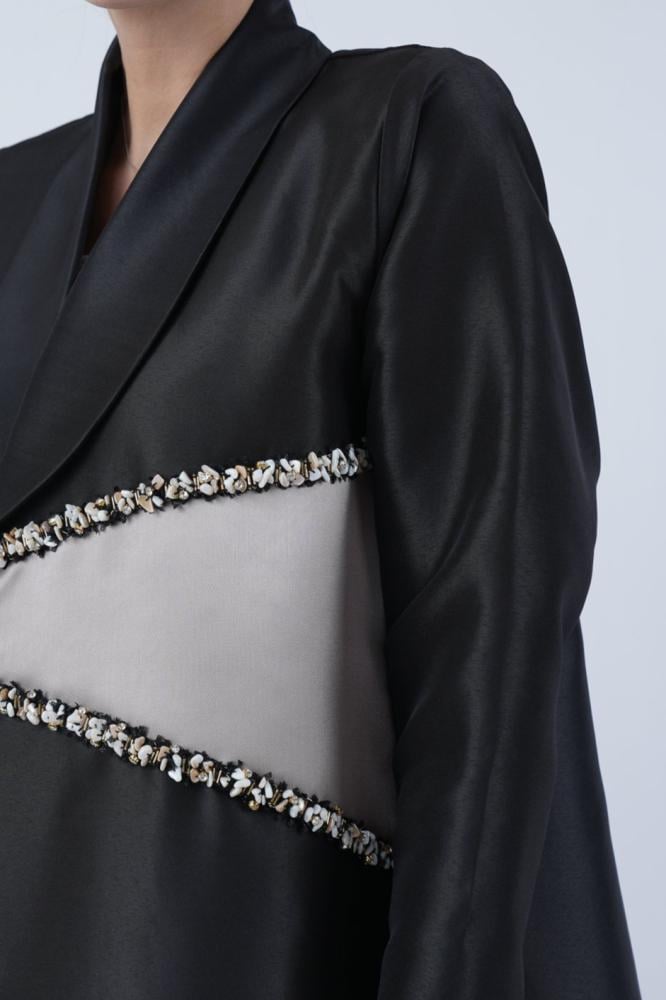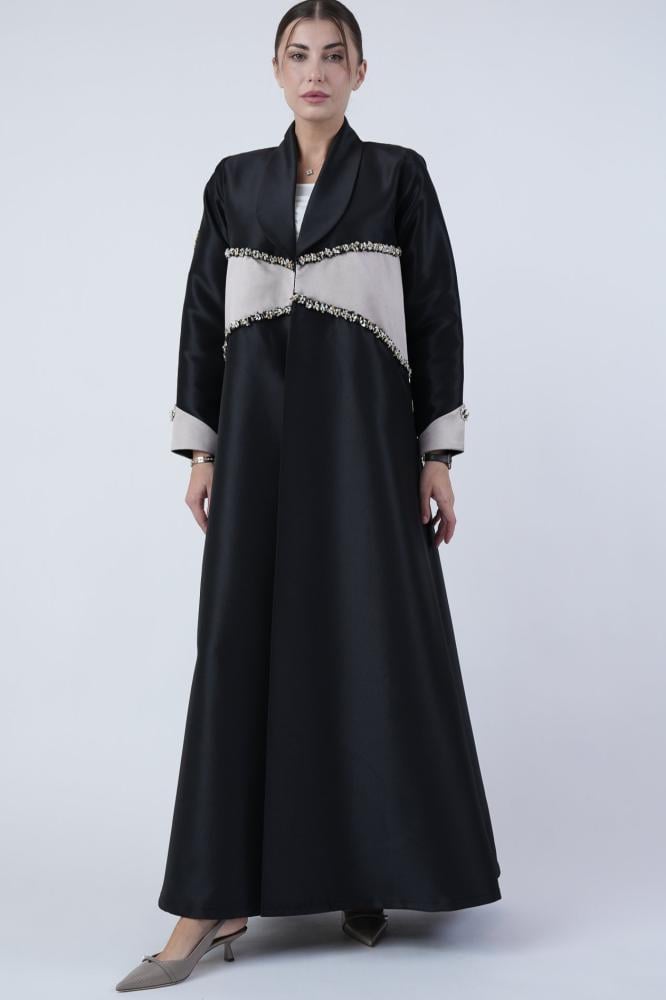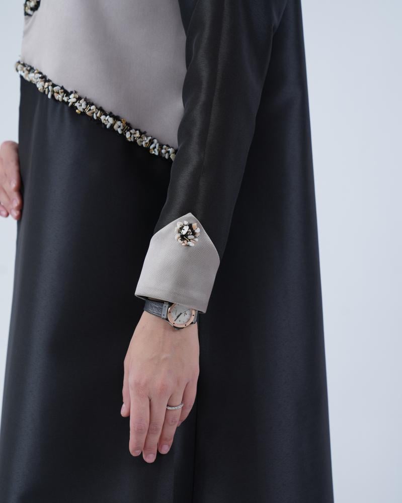 وصف العباية: عباية تفته أسود بشك ذهبي وأبيض صدف