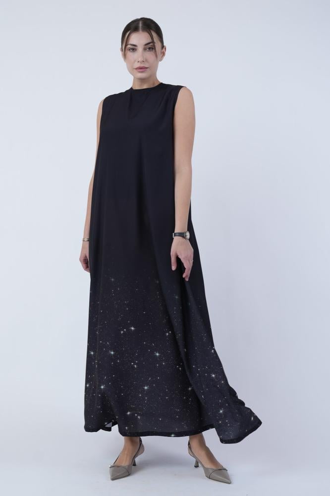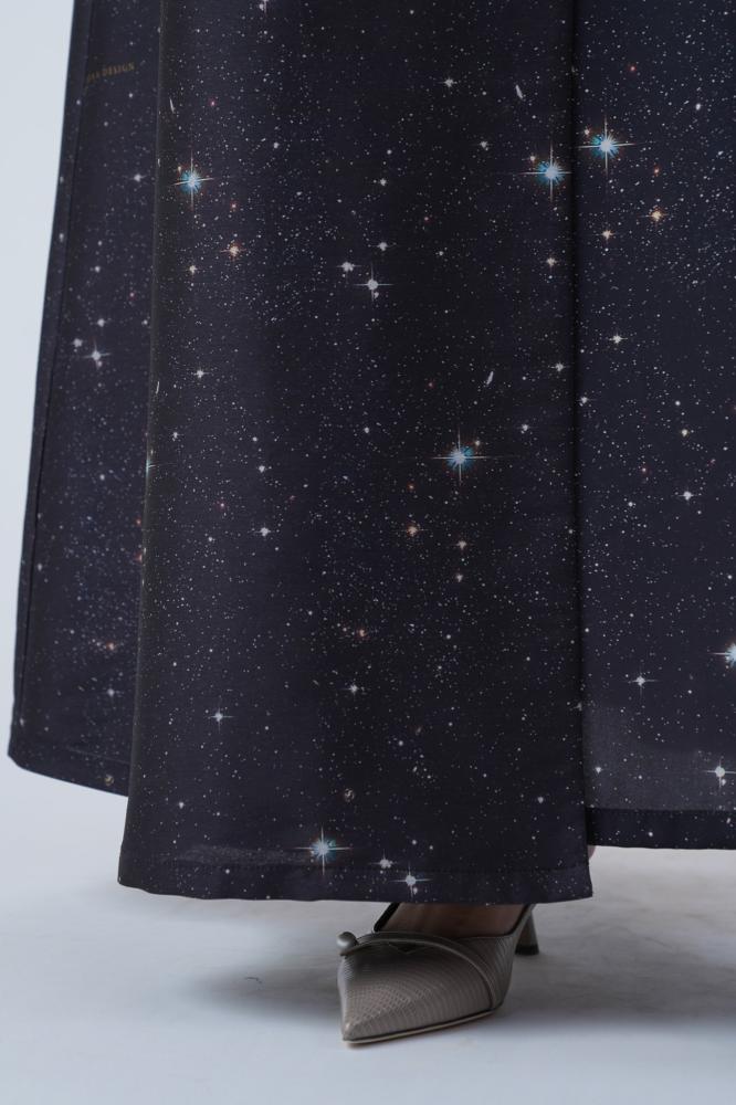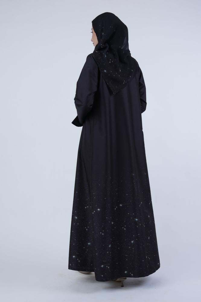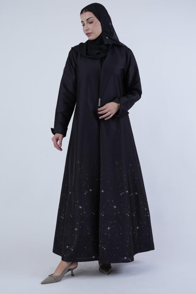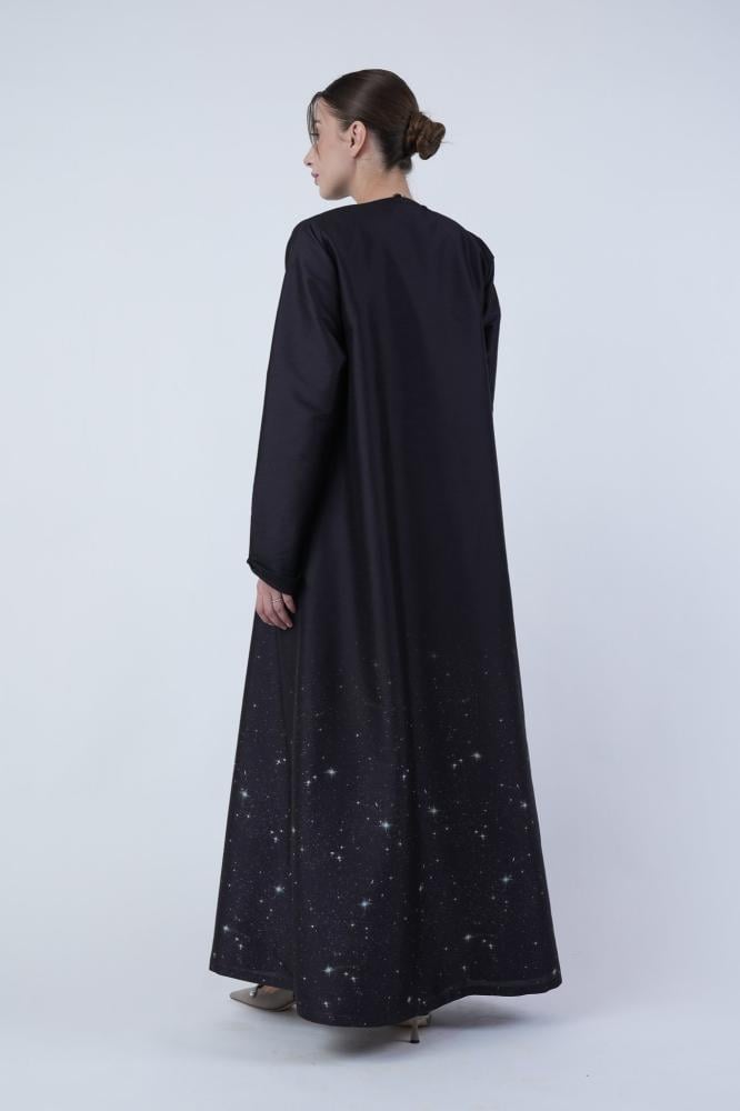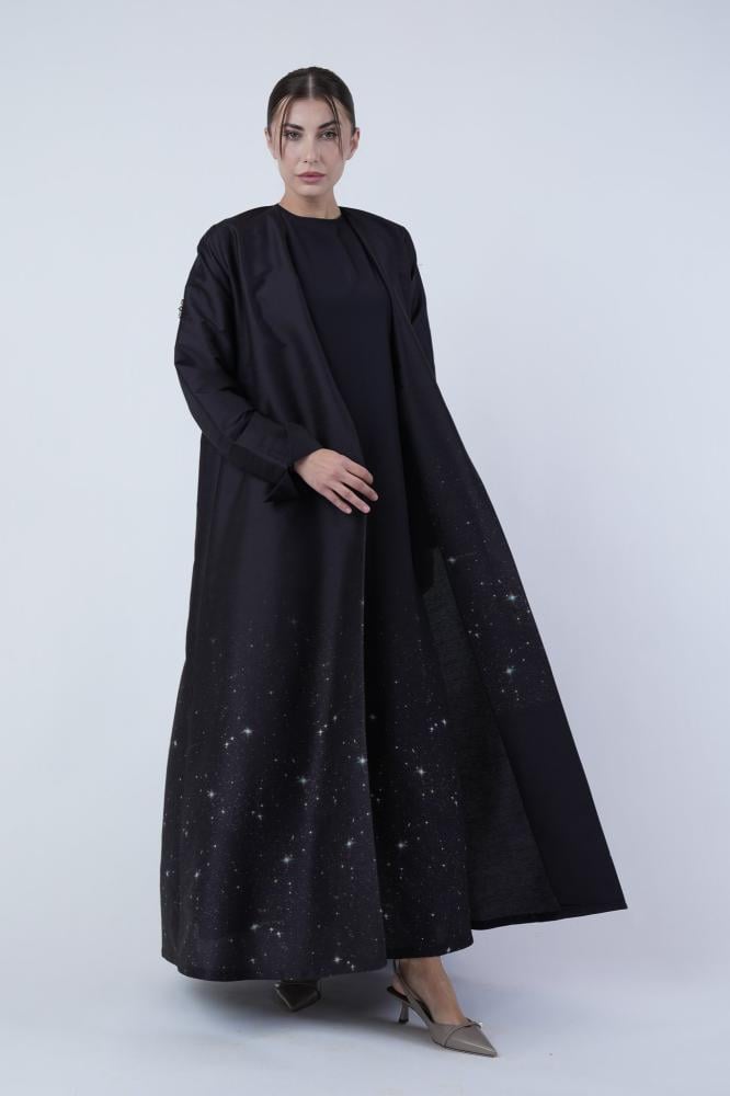 وصف العباية: عباية صيفية مصممة التفته الشانتون بطباعه خاصه نجوم من الامام و الأكمام و الخلف وفستان منفصل من الكريب الناعم وطرحه مزينه بنفس الطبعه