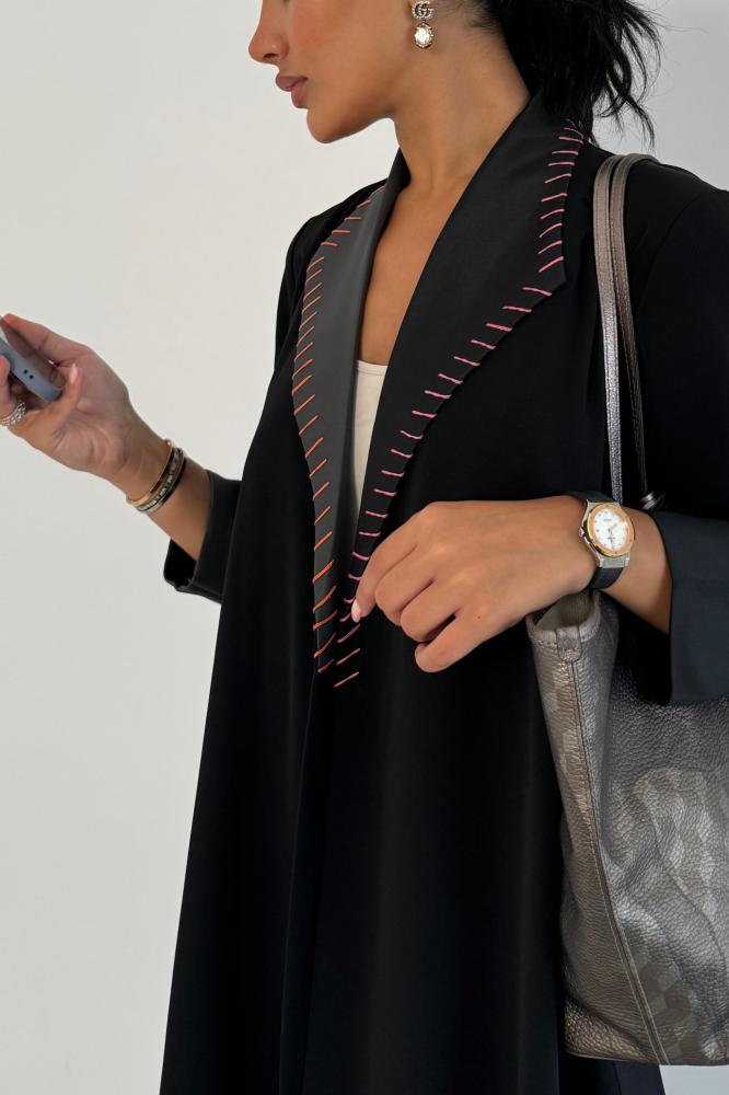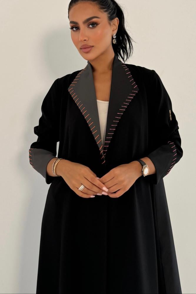 وصف العباية: عباية صيفية مصممة الكريب الياباني من الامام و الأكمام و الخلفه والياقه تفته أسود ورمادي بتطريز فوشي و أورنج