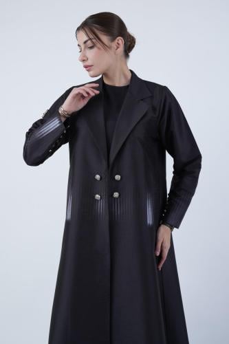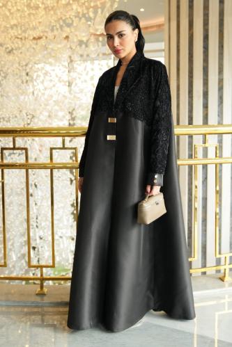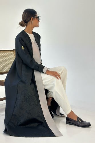 وصف العباية: عباية صيفية مصممة الكريب الـكوري الأسود بكسره على الكتفين مزينه بشك خيوط وخرز بيج واسود