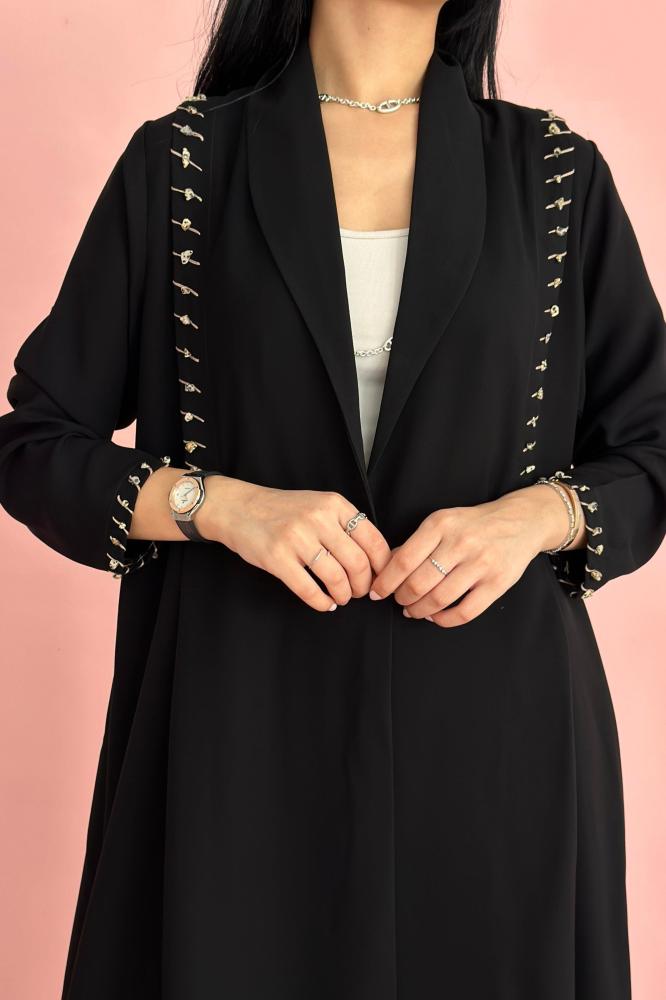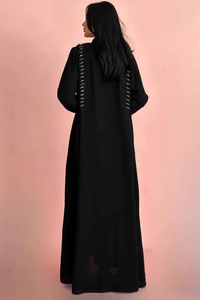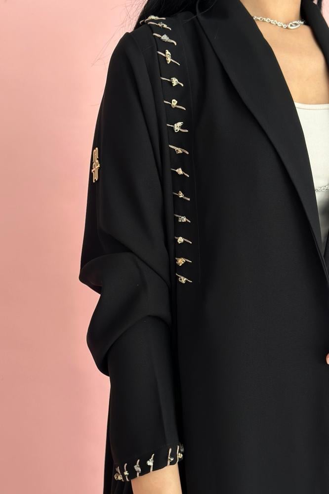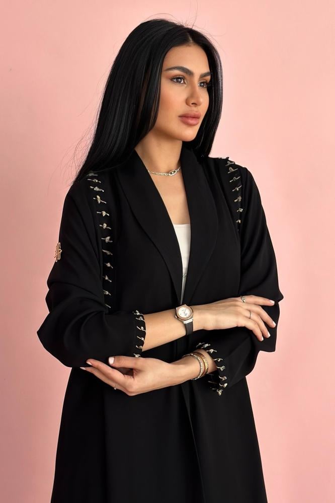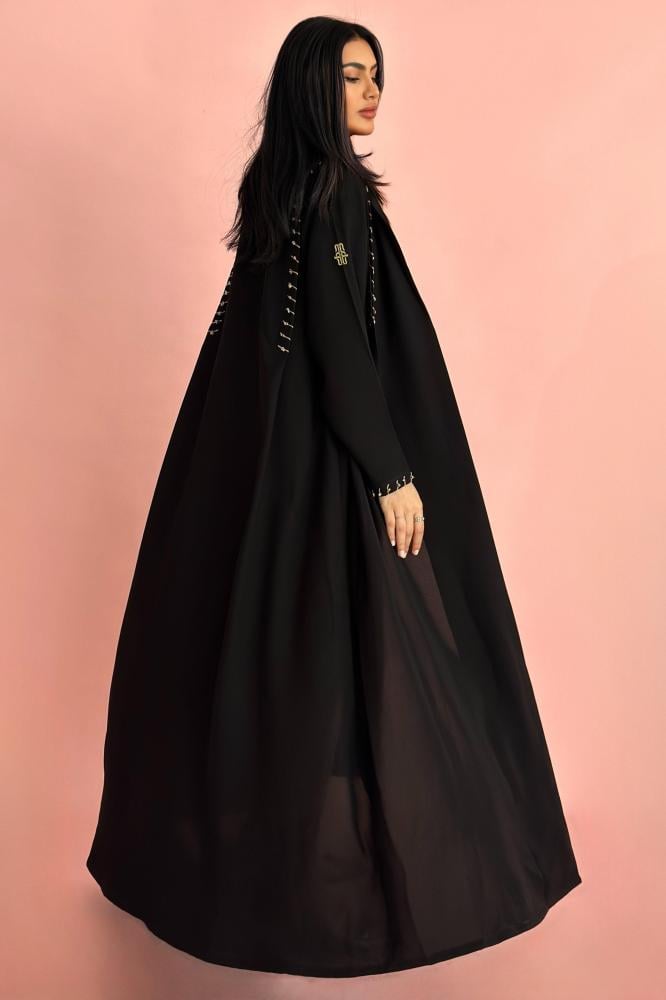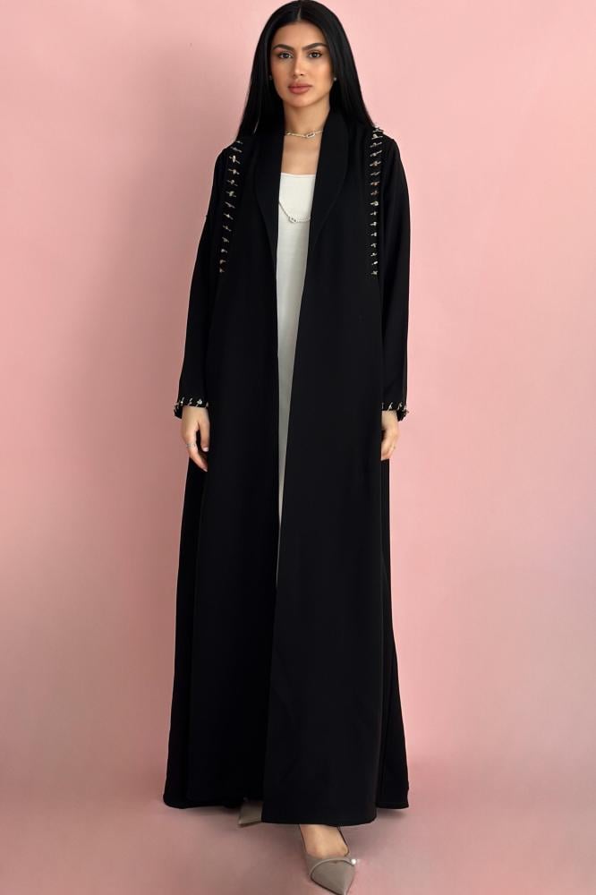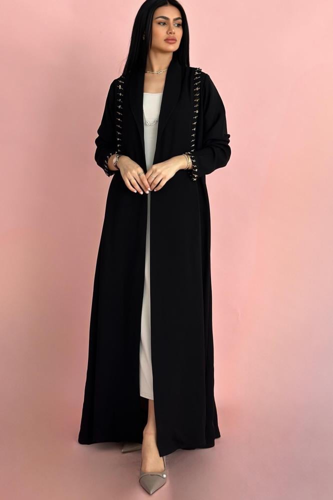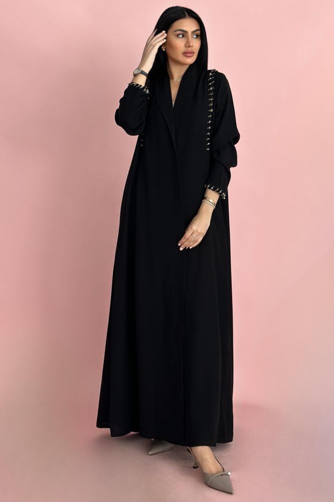 وصف العباية: عباية صيفية مصممة الكريب الـكوري الأسود بكسره على الكتفين مزينه بشك خيوط وخرز بيج واسود