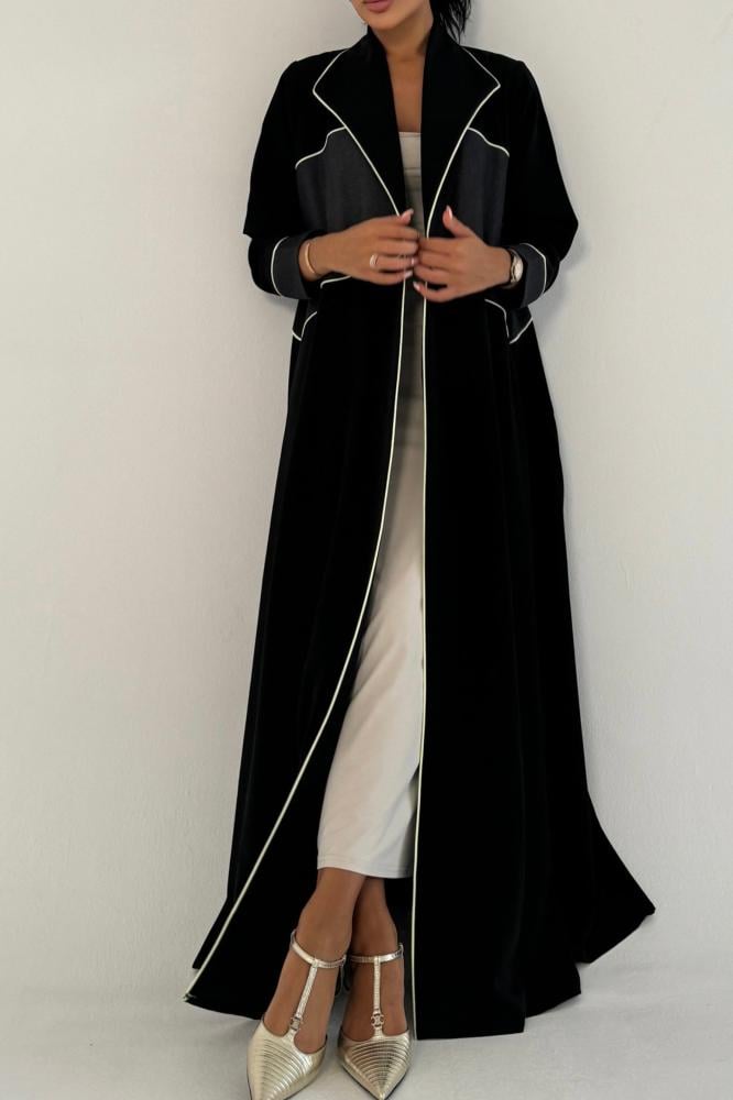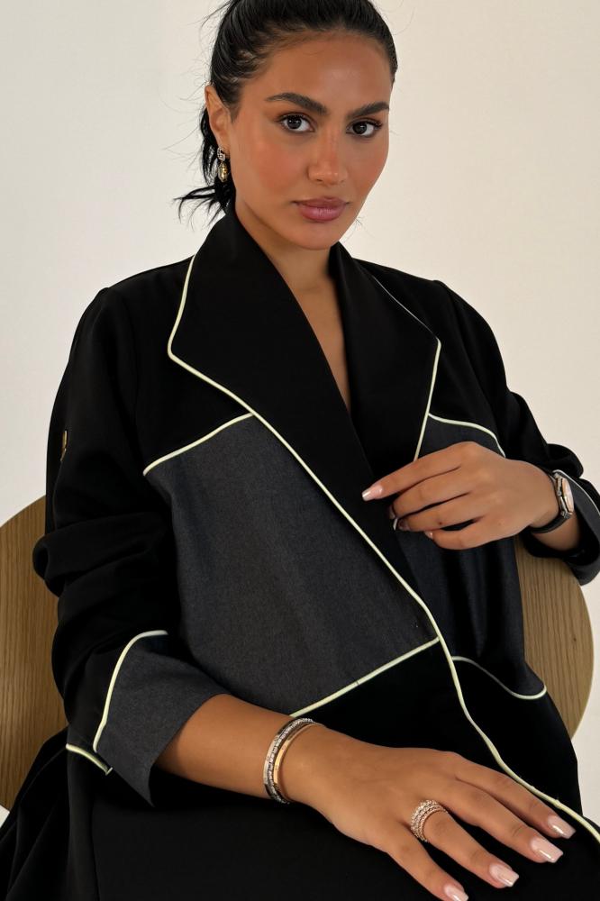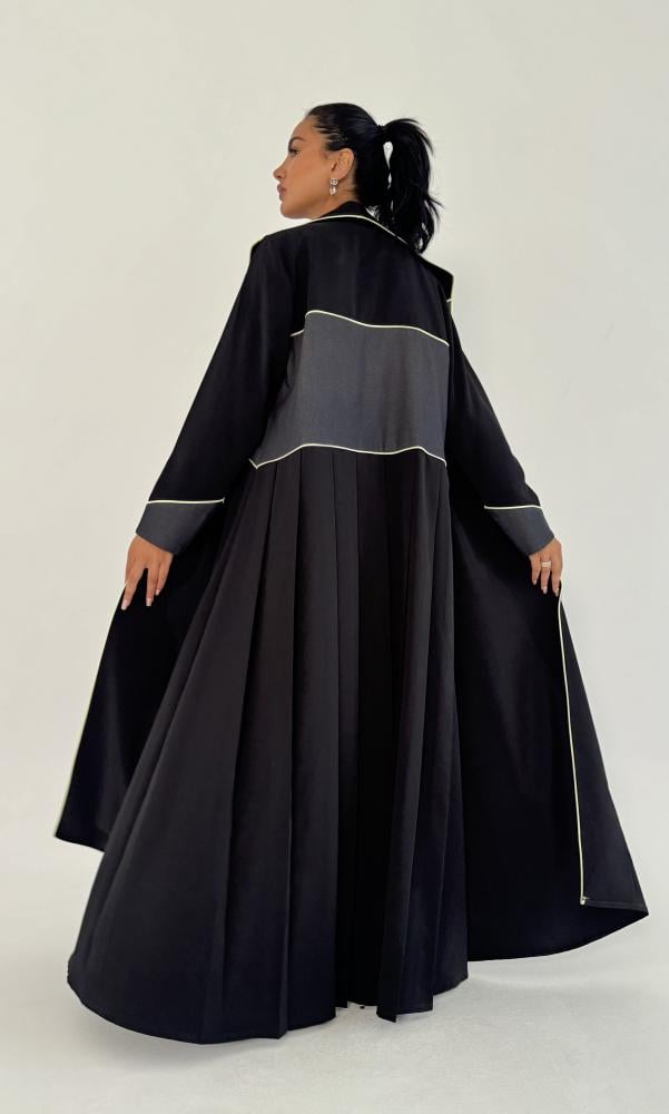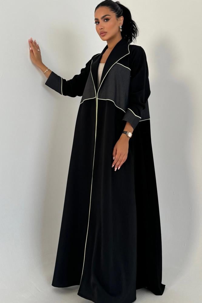 وصف العباية: عباية صيفية مصممة الكريب الياباني وقصه صدر قماش الجينز الأسود محدده بأصفر فسفوري
