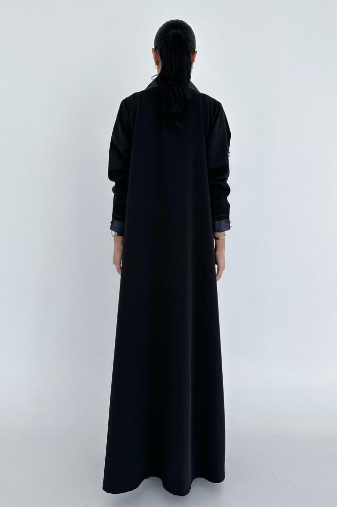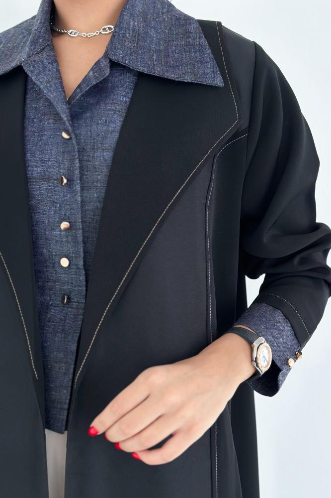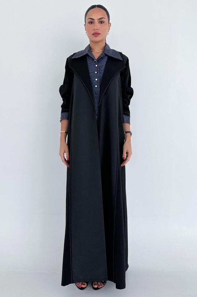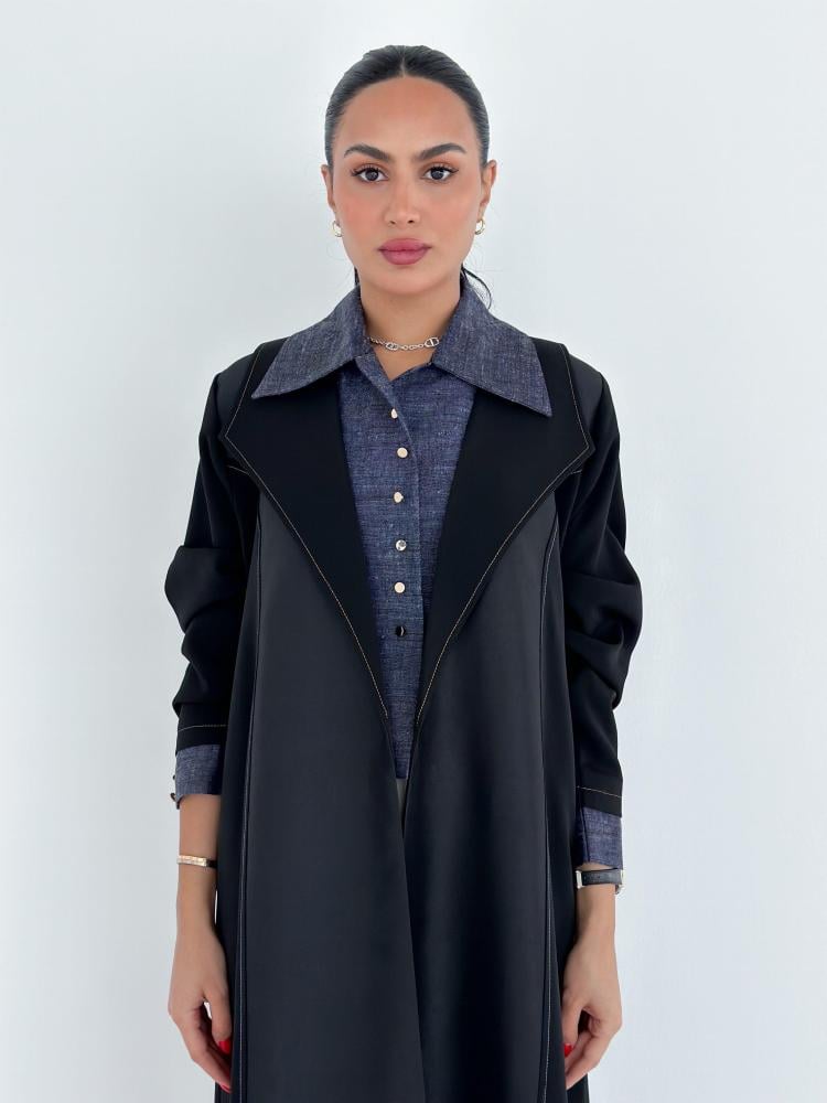 وصف العباية: عباية صيفية مصممة من الكريب الياباني الأسود وتفته اسود وقميص بنفسجي متصل قصير مزينه بازرار روز قولد