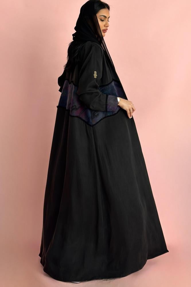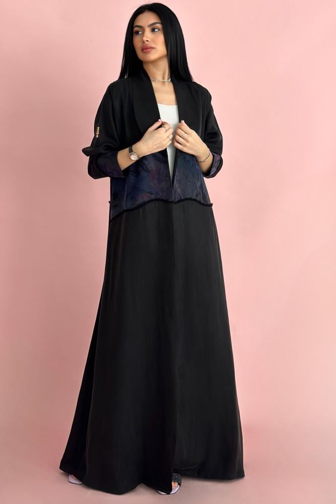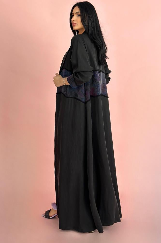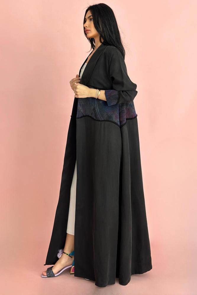 وصف العباية: عباية صيفية مصممة الحرير المغسول الـكوري الأسود محدده بهدب اسود