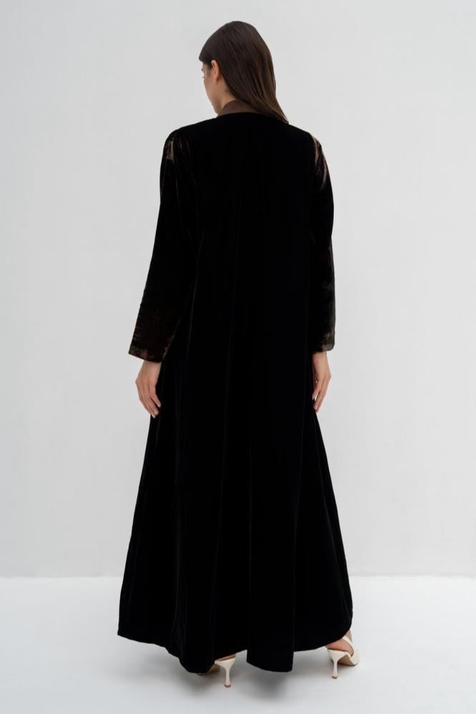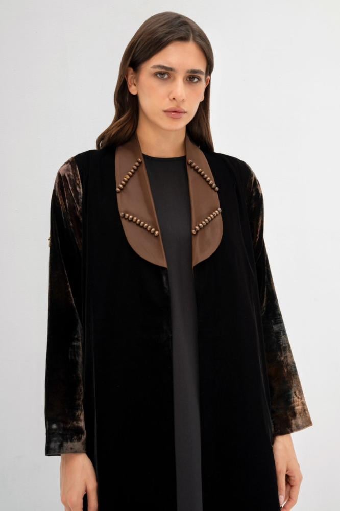وصف العباية: عباية مخمل أسود كوري مبطنه بالكامل ومزينه بخرز لولو خشب و اكمام مخمل بني مموج
