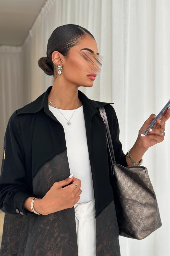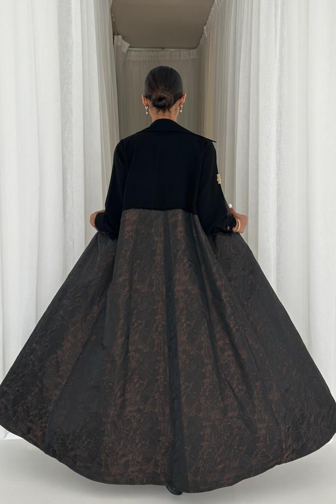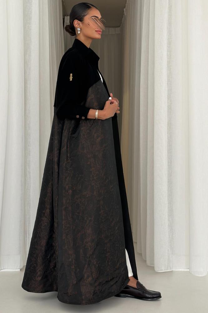 وصف العباية: عباية مصممة التفتة الشانتون الخفيفه لون أسود مموج ببني
