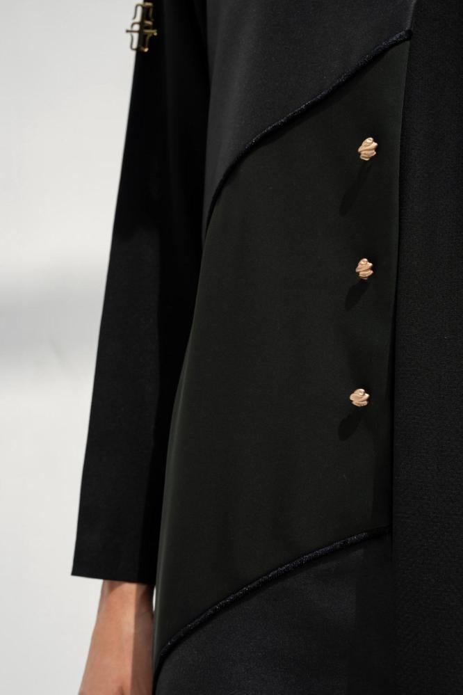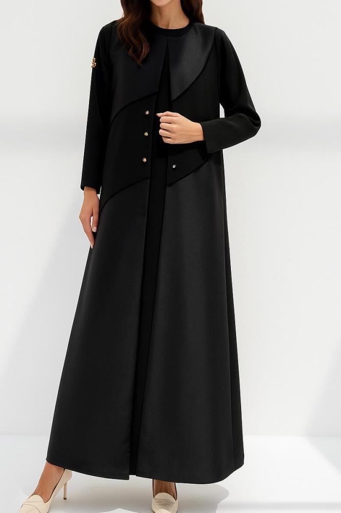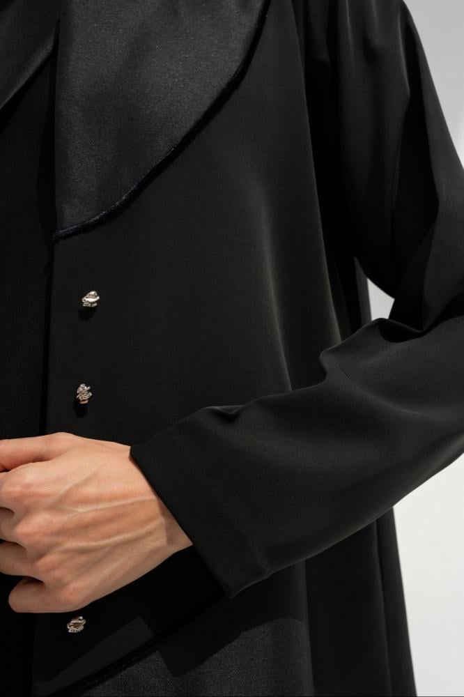 وصف العباية: عباية تفته أسود وكم كريب زيتي وكم كريب أسود مزينه بأزرار فضي وروز قولد